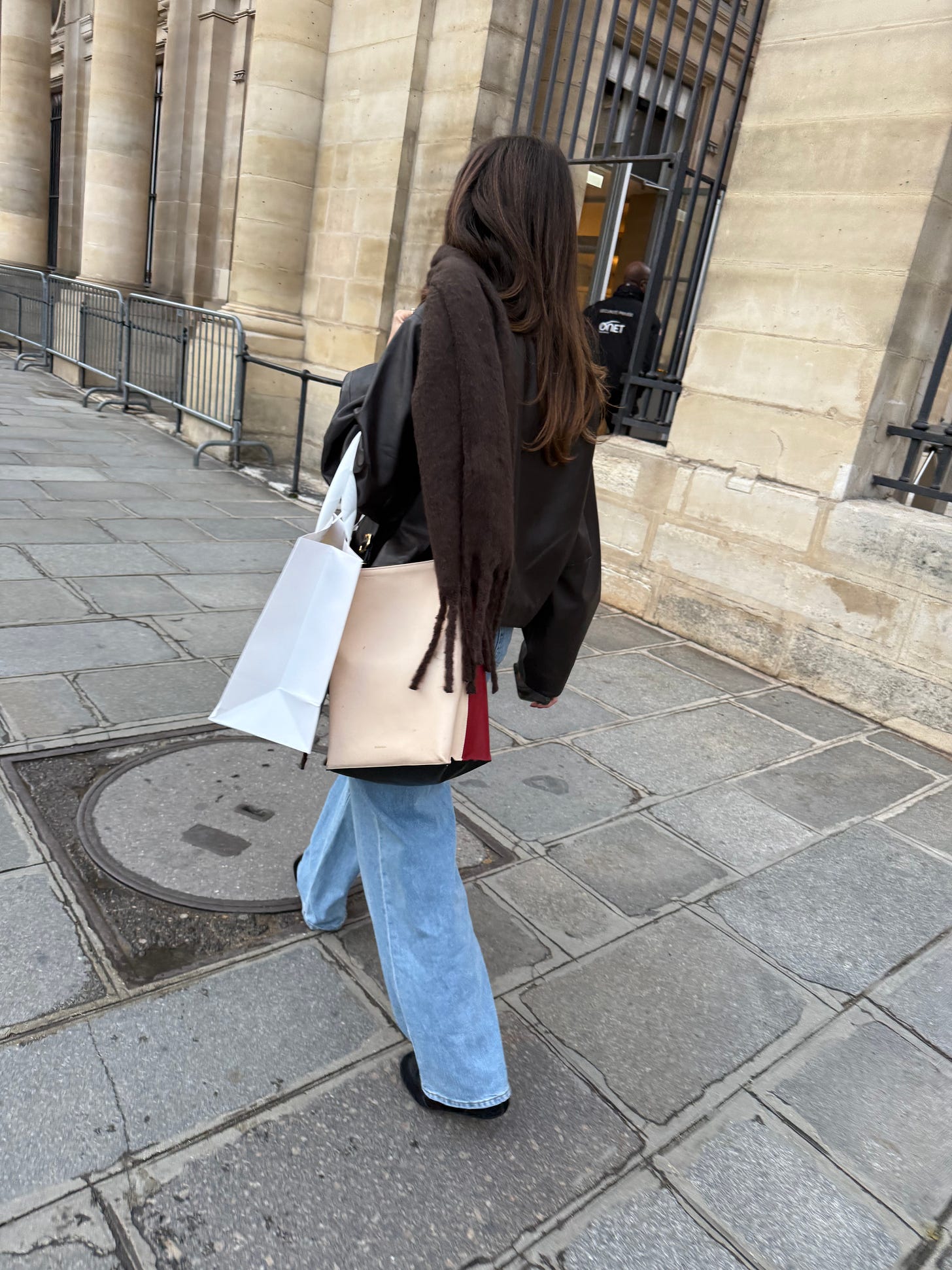 my friend doing it the french way while we were in Paris. She bought this brown scarf at Kiliwatch while we were there. The shoulder toss. Effortless, a little undone, no fuss. (Beyond the paywall. 1) Style Notes continued 2) Our Paris in Pictures. 30+ photos of what we did, what we wore, what we bought, and little moments in between and 3) a google map with all my stores)