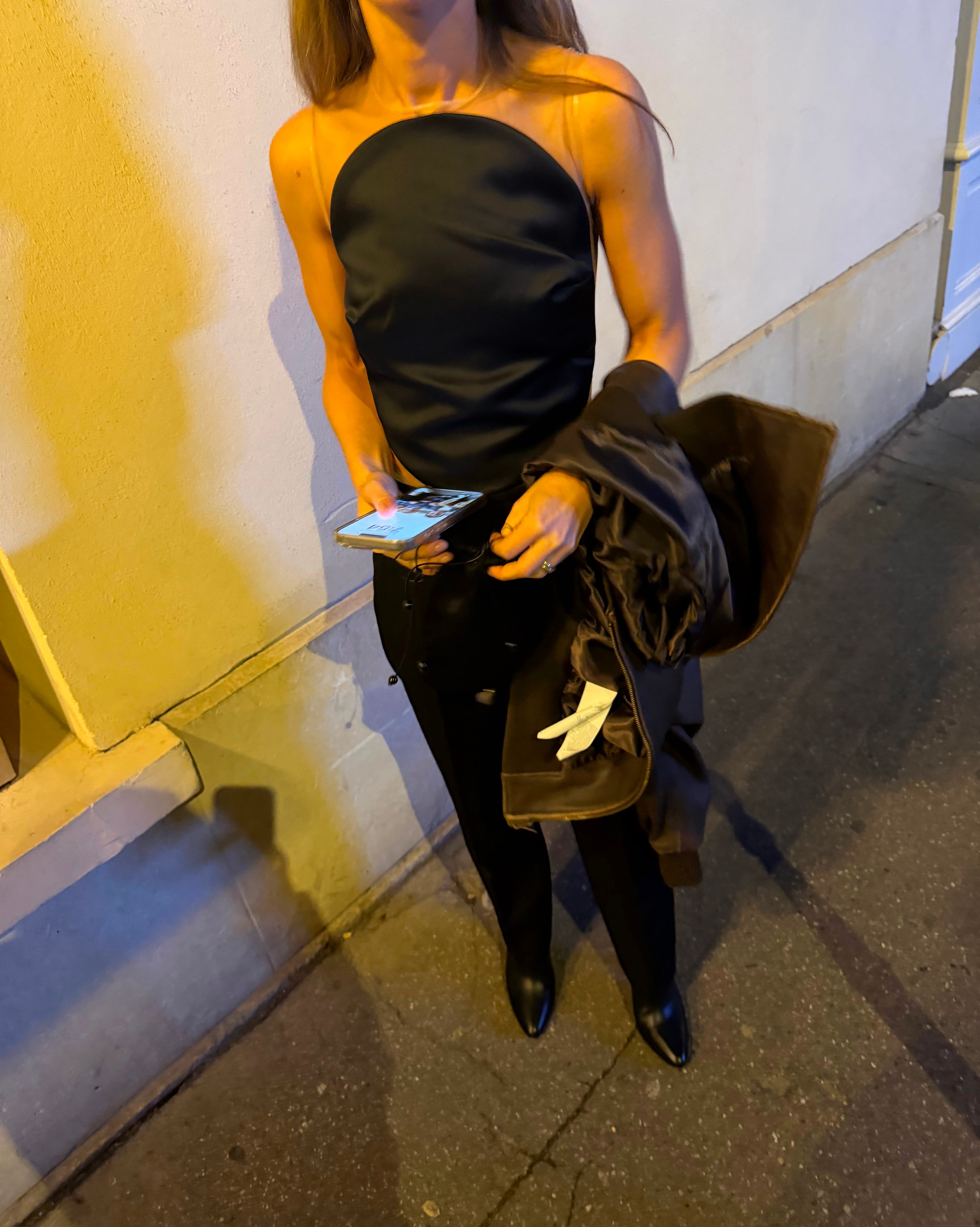 Nights are where I let myself have fun. Paris dinners are the perfect excuse to dress up and wear things you don’t reach for at home. An aspirational dressed up version of myself. I never shop for trips but admittedly when I bought this satin courrèges bodysuit back in september I definitely had paris in the back of my mind.